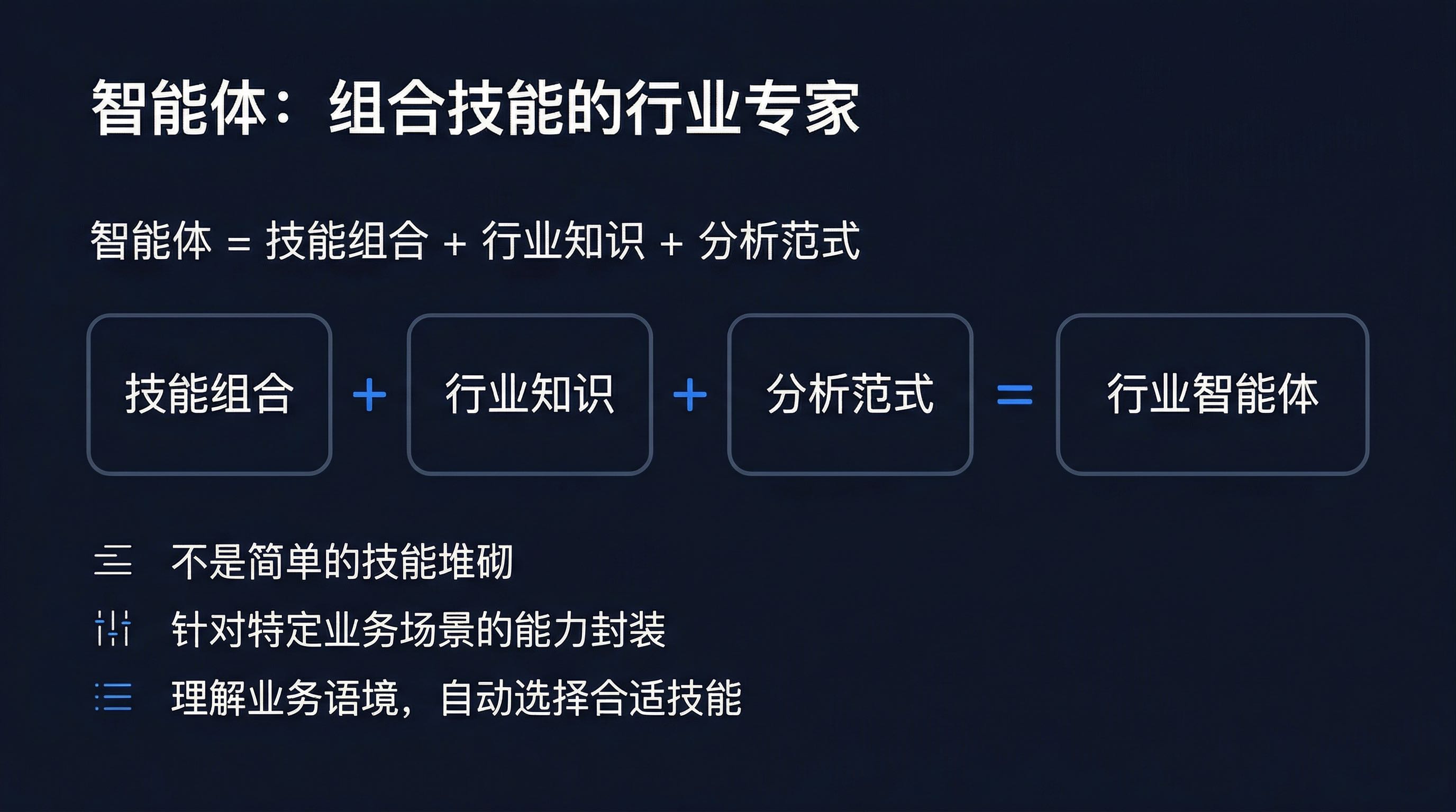 | 能力断层 | 只能做通用问答,无法执行专业的分析任务 | "它什么都能聊,但什么都不精" |