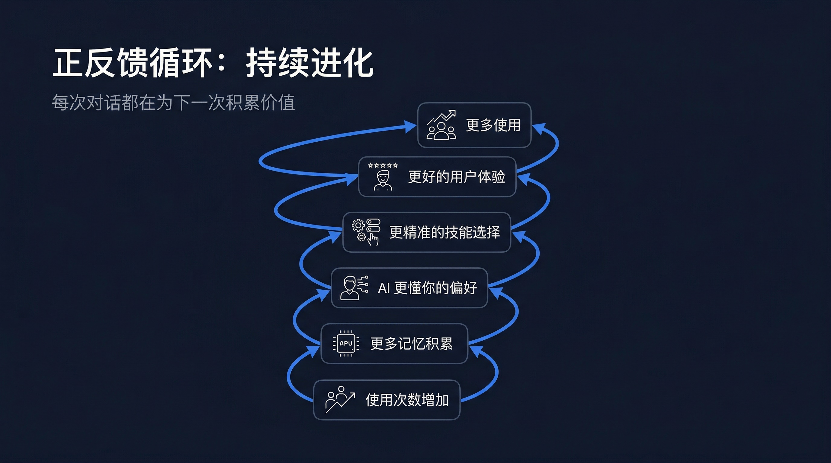 这套系统的核心优势在于它是一个会自我增强的正反馈循环: