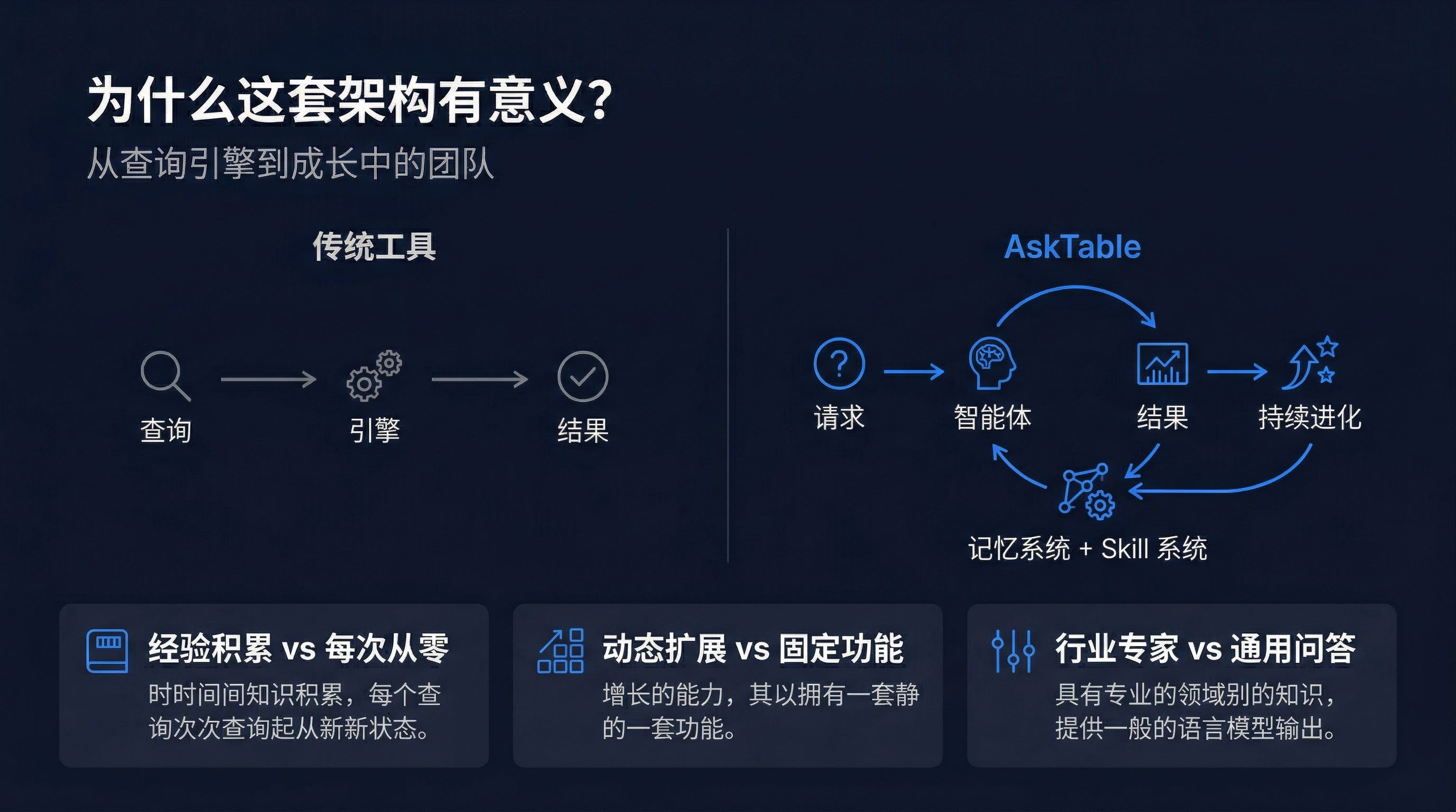 传统的数据分析工具,本质上都是**"查询引擎"**——你输入问题,它返回数据。每次交互都是独立的,没有积累,没有成长。